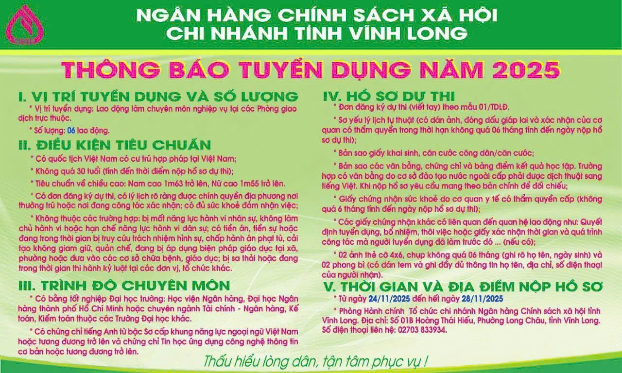 Ngân hàng chính sách xã hội chi nhánh tỉnh Vĩnh Long thông báo tuyển dụng lao động làm chuyên môn nghiệp vụ tại các Phòng giao dịch trực thuộc - năm 2025 như sau:
